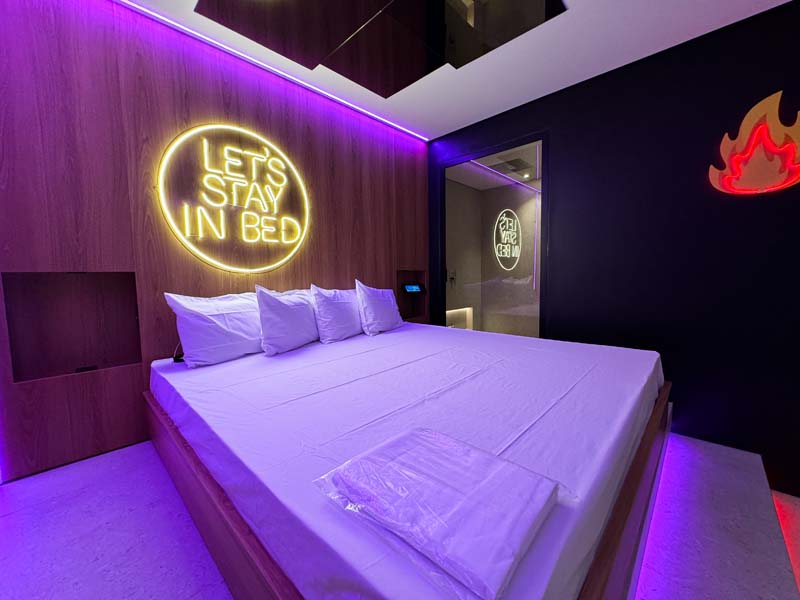 Essa suíte conta com: Cama king size, ar-condicionado, Smart TV 55”, ducha com cromoterapia, secador de cabelo, garagem privativa automática, internet, TV a cabo, automatização de luzes e som e espelho no teto.